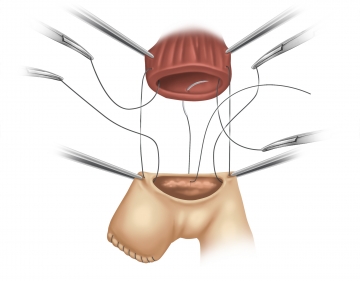 Construct the end-to-side esophagojejunostomy as a hand sewn single-layer anastomosis. First, incise the jejunal limb passed retrocolically into the upper abdomen at its antimesenteric aspect over 3 cm–5 cm. Follow this by preplacing the sutures for the posterior wall. Preplace all sutures of the posterior wall first, with the later knots resting on the inside. At the jejunum pass these seromuscular sutures from the inside out and then full thickness through the wall of the esophagus from the outside in. Use absorbable sutures size 4/0, e.g., Vicryl. With a sponge advance the jejunum along the preplaced sutures of the posterior wall toward the esophagus. Once the posterior wall of the esophagus has been aligned, tie the sutures of the posterior wall one by one. Construct the anterior wall also as a hand sewn single-layer anastomosis, but this time with the knots on the outside.